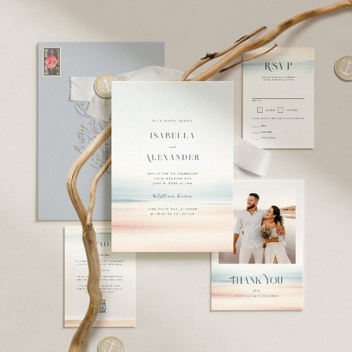 Entdecken Sie "Wailea", eine moderne Hochzeitssuite, die die Eleganz einer Zeremonie am Strand verkörpert. Dieses Template zeichnet sich durch eine abstrakte Aquarellgestaltung aus, die an einen Sandstrand erinnert, der mit den Meeresfarben verschmilzt. Es ist die perfekte Karte für Paare, die eine Mischung aus zeitgenössischem Stil und Küstenstreifen suchen und einen raffinierten Ton für ihre Feiern am Meer setzen möchten.