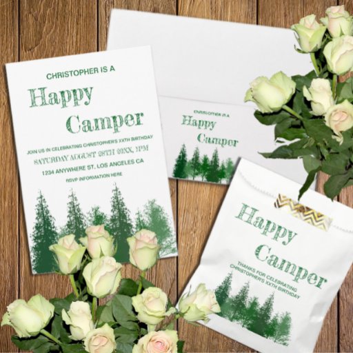 Glücklicher Camper Geburtstag mit Waldbäumen in verschiedenen Schattierungen grün