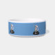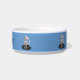 Katze auf blauem Hintergrund laufen, Katzenschüssel. Fügen Sie den Namen hinzu, indem Sie diesen Text ersetzen