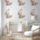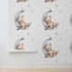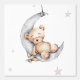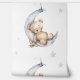 Repeated pattern of a cartoon baby bear asleep on the crest of the moon holding a toy plane surrounded by silver stars.