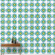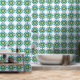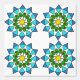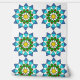 Mandala-Bild ist auf Papier gekachelt. Single Mandala hat einen äußeren Ring von Diamantformen in zwei Blautönen. Der nächste Ring zur Mitte ist grün mit roten Punkten. In der Mitte ist der gelbe Kreis.