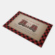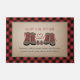 Illustration von zwei Paaren von Erwachsenenwanderstiefeln mit roten Schuhen in Herzform mit Babyschuhen dazwischen angeordnet. Personalisieren Sie sich mit Ihrem Namen. Gedicht sagt: "Weil kleine Hände Touch unsere Fußböden, verlass bitte deine Schuhe an der Tür" Hintergrund ist brauner Karottenbestand und Grenze ist rot und schwarz Büffel kariert.