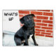 Ein sanfter, trauriger mit Augen Labrador will zu wissen, was in dieser Grußkarte oben ist