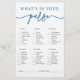 Ein lustiges und interaktives Brautparty-Spiel, bei dem jeder seine Taschen durchstöbern kann! Dieses "Was ist in deiner Purse?"-Printable-Spiel bietet ein modernes "etwas blaues" Design mit gestaffelten Punktewerten, um den Wettbewerb lebendig behalten. Die Gäste haben Karo von den Gegenständen, die sie in ihrem Portemonnaie haben und sammeln ihre Punkte. Der mit der höchsten Gesamtsumme gewinnt! Eine perfekte Ergänzung zu Ihrem klassischen blauen Brautparty.