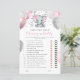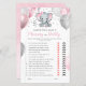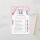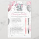 Diese Guess Who Baby Duschspielkarte bietet einen rosa und grauen Elefanten für Mädchen mit Ballons und Konfetti. Sie können die Fragen des Spiels personalisieren, indem Sie auf den Button "Personalisieren" klicken.