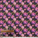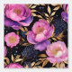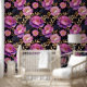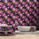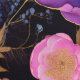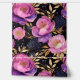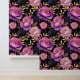Aquarellfarbene Pink und lila Pioniere mit blauen Babys atmen und goldene Blätter auf schwarzem Hintergrund.