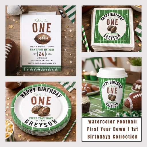 Feiern Sie mit dieser Watercolor Football "First Year Down" Einladung zum 1. Geburtstag Ihres kleinen MVPs großen Tag! Mit charmanten Aquarellbussen und sportlichen Details ist es perfekt für den ersten Geburtstagsbash Ihres zukünftigen All-Star. Personalisieren Sie sich mit Party Details und bereiten Sie sich auf ein Touchdown-Fest vor!