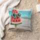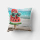 Eine Wassermelone mit Sonnenbrille im Sand des Strandes mit landschaftlicher Meereskulisse