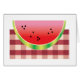 Eine köstliche Scheibe der saftigen Wassermelone auf einem überprüften Picknickstoffhintergrund.