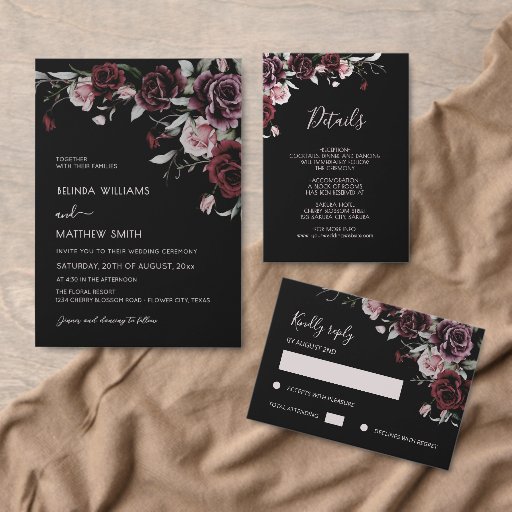 Dark watercolor roses enclosure card. With a headline in an elegant handwritten script.