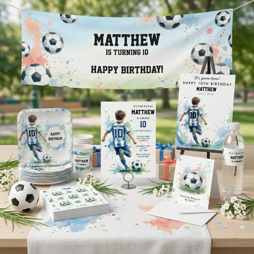 Serve up some team spirit with these artistic Soccer Birthday Party Paper Cups. Featuring a hand-painted watercolor illustration of a young soccer player in a light blue and white striped kit, these cups are a must-have for any sports-themed celebration. The wrap-around design includes vibrant blue and green paint splatters and scattered soccer balls for a modern, high-energy vibe.