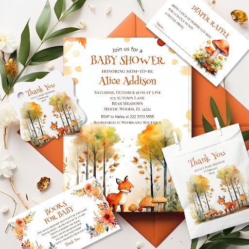 Eine whimsical Baby Dusche Einladungskarte mit einem niedlichen Fuchs in der Herbstwaldlandschaft vorne und einem eleganten Blumenmuster auf der Rückseite. Diese wunderschöne Karte wird mit Liebe für Sie und Ihren kleinen Abenteurer erstellt. Entworfen, um innen oder außen Babyduschen mit Herbstlandschaft, Wildblumen, Pilzen und einem sehr niedlichen Waldfuchs zu ergänzen!