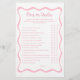Mit diesem Personalisierten Wavy Pink Over Under Brautparty Game können Sie Ihre Brautparty-Spiele mit Spaß spielen. Dieses Spiel eignet sich hervorragend für eine Kopplung des Knots-Brautparty-Themas oder für die Krawatte der Brautparty-Ideen. Dieses Spiel ergänzt ein Brautparty-Motiv mit stilvollen Bugkonzepten für ein charmantes Bogen-Party. Feiern mit dem off Markt Brautparty Thema und Liebe ist in Blumen Brautparty Thema, um unvergessliche Erinnerungen zu machen!