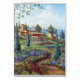 Italienische Szene, Lose von Blauem, grün, Blumen, Dorf im Abstand.