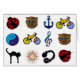 Eine niedliche grafische Komposition: ein Ladybug + eine Eule + Anker + Yin-Yang-Symbol + ein Farbrad + Musiknote + eine schwarze Katze + compass_Rose + ein Musikkopfhörer