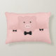 Ein akzentes Kissen mit einem zeichn eines niedlichen rosa Schweinegesichts. Von seinen schwarzen Klauenhofen erheben und über einen Tisch pinkeln. Niedlicher und skurriler zeichn. Set auf einem rosa Hintergrund mit verblassten Herzen.