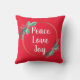 Mit diesem schlichten, modernen Design eines Kranzes aus Goldbändern und zwei heiligen Sprüngen verleihen Sie Ihrem Weihnachtsdekor ein wenig Freude. Im Inneren des Kranzes ist die Urlaubsbotschaft von "Friede, Liebe und Freude" in zeitgenössischer Typografie geschrieben. Dieses Kissen ist reversibel, eine Seite ist weiß mit roter Schrift und die andere Seite rot mit weißer Schrift.