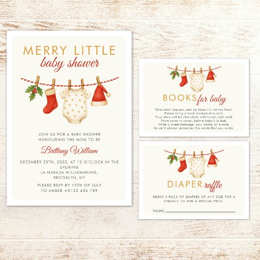 Dieses Design beinhaltet das Weihnachtsduschthema "Merry Little Baby Shower" mit Baby-Wäscheleine, Baby-Romper, Weihnachtsmannmütze und Weihnachtsliedern Strümpfe. Ideal für einen Winterurlaub mit Babydusche. Wenn Sie Hilfe bei der Anpassung des Produkts benötigen oder passende Produkte benötigen, kontaktieren Sie mich bitte über Zazzle.