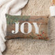 Rustikaler Holzboden mit Nadelbäumen und Weihnachtsbeeren, der das Wort "JOY" umschreibt. Ein wunderschönes Weihnachtsbaumdesign, ideal für die rustikale Weihnachtsdekoration im Wald.