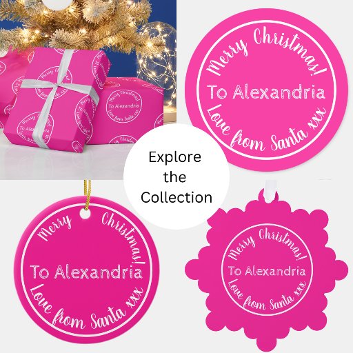 Das ist eine personalisierte Liebe vom Weihnachtsmann, Weihnachtsdesign. Es hat ein niedliches typografisches Design in trendigem heißen Rosa mit weißer Schrift Typografie. Es hat die Botschaft "Zu Alexandria Frohe Weihnachten! Liebe von Santa xxx". Fügen Sie einfach den Namen Ihres Liebsten hinzu, indem Sie dieses Textfeld personalisieren. Hier können Sie auch die Erholung des Textes ändern, wenn Sie gewollt werden. Karo aus dem Entwurfsbearbeitungsprogramm, um die Farbe oder den Schriftart zu ändern. Ideal für personalisierte Geschenketiketten oder für Gastgeschenk Tags. Für Hilfe bei Personalisierung, passenden Produkten oder für ein individuelles Design kontaktieren Sie mich via zazzle Chat.