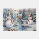 Schöne Weihnachtsmatte mit zwei Schneemännern mit roten Schals und Top-Hüten. Sie sind an einem hübschen, eisigen Fluss stehend. Schöne Winterlandschaft mit gemütlicher Blockhütte in einem Kiefernwald. #generativecontent