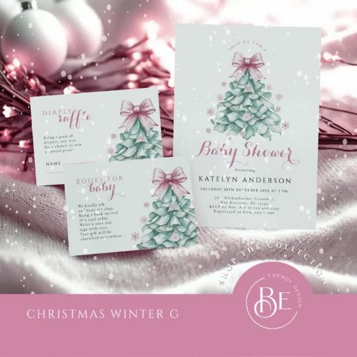 Feiern Sie die Ankunft Ihres kleinen Mädchens mit dieser charmanten, winterlichen Baby-Dusche-Einladung. Dieses elegante Design mit einem aquamarinen Weihnachtsbaum und einem zarten, rosafarbenen Bogen, umgeben von pastellfarbenen Schneeflocken, verbindet festlichen Charme mit einer weichen, coquette Touch. Ideal für einen unvergesslichen Winter Babydusche mit einem skurrilen, aber raffinierten Gefühl.