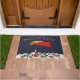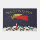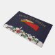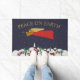 Diese Begrüßungsmatte hat eine Winterszene eines Engels, der über eine Stadt fliegt, während sie ihr Horn spielt. Oberhalb der Worte lesen "Weltfrieden" in einem Imitat Goldtypografie. Entworfen von Künstler ©Susan Coffey.