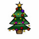 Ein niedlicher Karikaturenbaum mit gelben Sternen und roten, rosa und violetten Kugeln und einem großen Stern. Es hat eine kühne weiße Kontur.