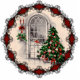 Ursprünglich ein Schwarz-Weiß zeichnend aus den frühen 1900er Jahren, ist diese Weihnachtsfensterszene mit Weihnachtsbaum und Lichtern ein großartiges Urlaubsornament für den Baum.