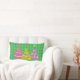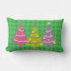 Ein skurriles Design mit rosa, lila und grünen Weihnachtsbäumen. Der Hintergrund ist ein grün und kalkgrün kariertes Muster.