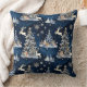 Kissen in einem festlichen Weihnachtsgeflecht von Weihnachtsbäumen, Rentieren und Schneeflocken vor dunkelblauem, sternenbraunem Hintergrund