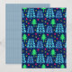 Grüne, blaue und türkisfarbene Weihnachtsbäume mit gelbem und rotem Schnee auf dunkelblauem Hintergrund.