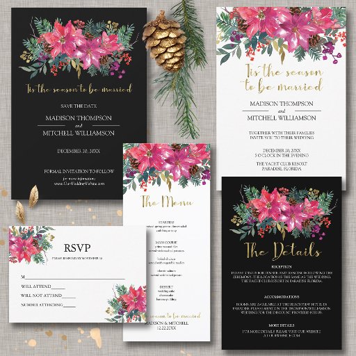 Mit dieser modernen und eleganten Bouquet-Einladungssuite poinsettia werden Ihre Weihnachtswintertraume wahr. Das rosa und rote Poinsettienbouquet ist mit Grünpflanzen, Kiefern, Zweigen, Kiefernzapfen, roten, heiligen Beeren und goldenen Akzenten versehen. Diese Einladungs-Suite ist ideal für eine elegante und moderne Winterhochzeit.