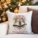 Dekoratorkissen mit goldenen Weihnachtsglocken mit rosa Blume. Anpassbarer Text sagt "Frohe Weihnachten".