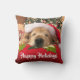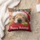 Fügen Sie ein wenig goldenes Glück Ihrem Zuhause dieses Weihnachten hinzu! Dieses Throwkissen kennzeichnet eine Fotografie eines Hundes des goldenen Retrievers, der auf einem Kissen unter einem Baum schläft, und des Tragens einer roten Weihnachtsmannmütze. Kundengerechter Text liest, "frohe Feiertage!"