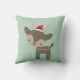 Ein niedliches und festliches Kissen mit minimalistischem Hipster. Charmante Illustration eines braunen Waldhirsches mit roter Weihnachtsmannmütze - Hipster Stil. Set auf einem grünen Hintergrund im Retro.