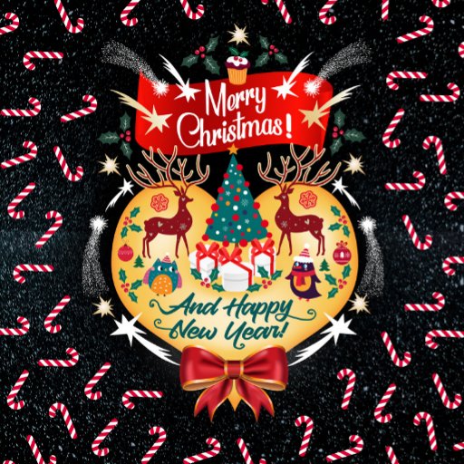Das ist ein fröhliches Weihnachtsdesign mit spielerischen Elementen, Hirsch, Eule, Pinguin, Weihnachtsbaum, Mistletoe, Kuchen, Sternen, Geschenken, Bogen, einem großen goldenen Herz und einem besonderen Wunsch für ein glückliches Neues Jahr.