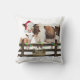 Niedliche Aquarellkuh mit Kalb und mit einem Weihnachtsmütze mit rustikalem Zaun mit Urlaubsleuchten und Schild.
