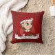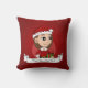 Das Kopfkissen mit einer Abbildung eines niedlichen lächelnden Mädchens mit langbraunem Haar, trägt das Mädchen ein Weihnachtskostüm mit rotem Hut und hält ein Geschenk; in einem roten Kreis auf rotem Hintergrund, mit einer anpassbaren Textvorlage für Ihren Namen oder Ihre Nachricht.