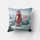 Niedlicher Pinguin mit roter Kappe und Schal auf einem Eisberg mit einem frohen Weihnachtszeichen in der Antarktis