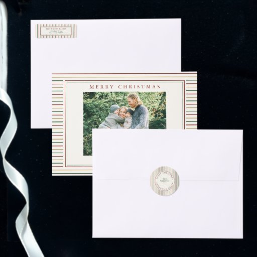 Gestalten Sie Ihre eigenen Weihnachtsschmuck mit einem Ihrer Lieblingsfamilienfotos, personalisiert minimalistischen Typografiebezeichnungen und Jahr auf einem einfachen Streifen Hintergrund in rot-grün und goldfarben.