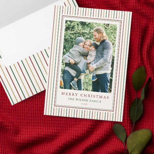 Gestalten Sie Ihre eigenen Weihnachtsschmuck mit einem Ihrer Lieblingsfamilienfotos, personalisiert minimalistischen Typografiebezeichnungen und Jahr auf einem einfachen Streifen Hintergrund in rot-grün und goldfarben.