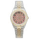 Die Armbanduhr hat ein geometrisches Design, in dem sich rote und tiefe rote Dreiecke wiederholen, die mit grünen Kreisen oben auf einem weißlichen Feld angeordnet sind. Das gleiche Design in verschiedenen Farben gewollt? Nachricht.