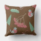 Ein niedliches Weihnachtskissen mit festlichen Wintervogelmustern in Pullover, Weihnachtsbäumen, heiligen Blätter, roten Heiligenbeeren und Schlitten mit Geschenken auf braunem Hintergrund, um Ihrem Zuhause eine Urlaubsstipendesignerin Touch für die Ferien hinzuzufügen.