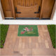Diese Außentürmatte ist dunkelgrün mit dem Text Frohe Weihnachten in leuchtendem Gold zusammen mit einem rot-weißen Weihnachtszug mit dem Weihnachtsmann als Fahrer, der Bonbons, grüne Heilige und Briefe zum Weihnachtsmann trägt.