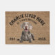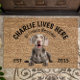Weimaraner Personalisiert Hundeliebhaber willkommen vor der Tür. Diese Begrüßungsmatte kann mit dem Namen Ihres Hundes personalisiert werden, der Slogan kann auch geändert werden oder Sie können ein Foto Ihres eigenen Hundes verwenden (stellen Sie sicher, dass es transparent ist). Der Text lautet: Charlie lebt hier... Alle Leckereien begrüßen das Bearbeiten des Designs, um den Schriftart, die Farben und die Hintergrundfarbe zu ändern. Verwenden Sie beim Ersetzen des Hundes ein transparentes Bild. Ein wunderbares Geschenk für ein Party, Ferien, Hundefreunde und für jeden Anlass.