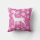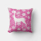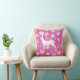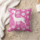 Ein hübsches und festliches Urlaubskissen mit vielen weißen Schneeflocken und einer weißen Silhouette Reh auf einem heißen rosa Hintergrund.