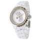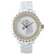 Eine skurrile, einzigartige Uhr mit weißer Band und funkelnden Details. Die Highlights sind das aufwändige Design und die lebhaften Farben, während sanfte, diffuse Beleuchtung seinen Charme verstärkt.