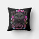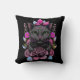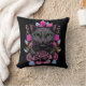 Fun accent werfen Kissen, mit Kunstwerken einer skurrilen grauen Katze und rosa Blume, vor einem schwarzen Hintergrund. Niedliche Geschenkidee für jeden Liebhaber der Stiefel.