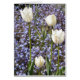 Weiße Tulpen im Bett hübsch blauer Blumen in Warminster.